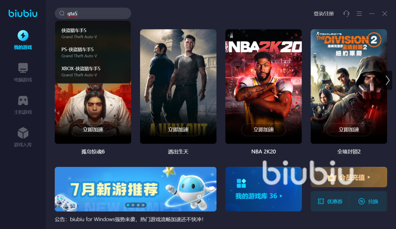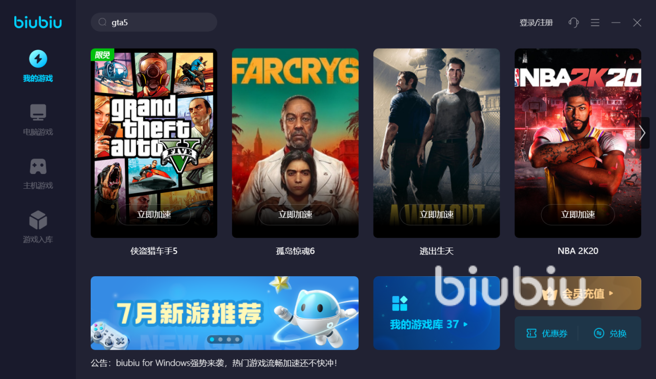 最重要的是biubiu软件费用超低,办理月卡只需要十元。新用户初次登录前面七十二小时使用免费,第一次充值只要四折,后续使用月卡即可,为几万款国内外游戏加速。为了回馈新老用户,平台推出长期和限时活动,支持STEAM和暴雪等平台限时免费加速。