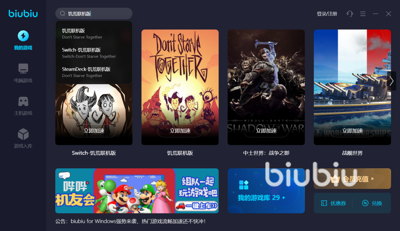 以上就是为什么饥荒联机版进不去房间的相关攻略,biubiu是一款百搭的辅助工具,支持海量游戏加速,完美匹配国内和国外游戏。在游戏专区,玩家们找到全部热门游戏,然后一键为端游加速,让游戏呈现最流畅的画面。