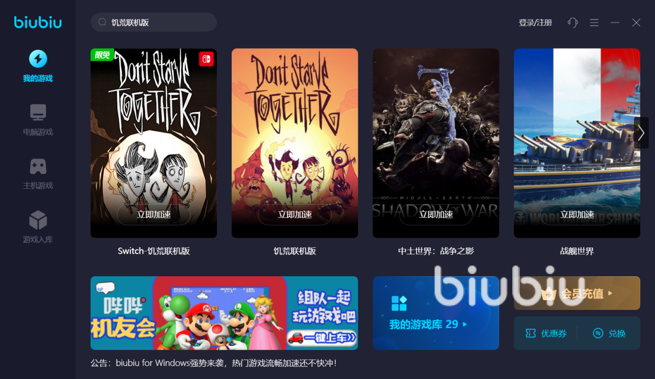 biubiu作为宝藏工具,它实时回馈用户们,推出新用户限时三天免费,以及SWITCH、STEAM、暴雪等平台限时长期免费。饥荒联机SWITCH版正在免费行列中,玩家们赶紧体验一下吧。针对其他游戏,玩家在免费期限之后,使用白菜价月卡即可加速。