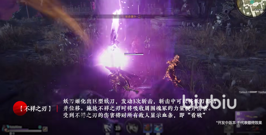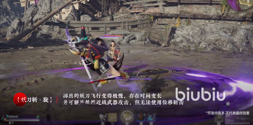 而在打的时候记得先把战技放了,你会直接扔出一把回旋刀,不用担心和你手上拿的兵器时独立的,并且会格挡掉远程弹道的袭击,如果你点出天赋放弃二段的位移效果,它会持续时间变长并额外获得近战的伤害格挡,在与人对拼时,妖刀姬可以凭此招占据很大优势。