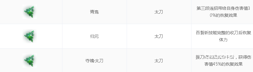 到后面拿到紫色太刀的话,还是建议用一用的,普攻和小连招只有0.3秒的前摇,一般玩家基本反应不过来就被砍了,你甚至可以去安装魂玉夺魂·太刀,这东西其实也算不上稀有,会让你振刀终结招式获得恢复效果,但切记仅仅在敌人蓄力时,你才可以鼠标左右交替连按进行“振刀”,这招只克制蓄力一击会将敌人武器直接击落,如果对手是普攻的话,这么按只会让自己被打的换不了手。而青鬼和归元也能触发其他连招的回血,可以说是打架续航的神器。