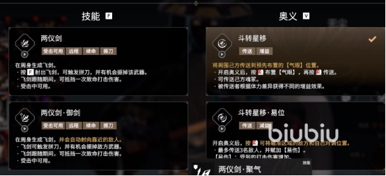 V1斗转星移,这个技能需要提前标记气眼,它会持续150秒,再次按下V键,可以传送40米内没有变身的队友,传送至气眼或者剑冢。如果被传送的队友体力在80%以上,会在30秒之内获得一个提高10%攻击的buff。如果低于80%,则会获得30秒10%的减伤。