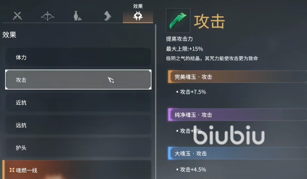 永劫无间的魂玉能对英雄的五个方面进行加成,分别是体力、近抗、远抗和攻击。这四种不是我们带得越多,效果就叠加得越多,而是每种都会有一个上限。比如大部分玩家都很喜欢的攻击魂玉,在战斗百科里面就说明了这个类型的材料,加成的上限是15%。一个金色的材料加成是7.5%,如果可以叠加的话,哪怕我们装备上了六个,系统显示的攻击力也只增加了15%,这代表其他多带的也都是无效的。