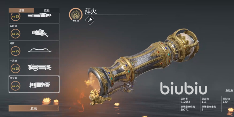 这东西没有连招拿到之后直接按左键发动会向前方范围喷射大量火焰,造成持续伤害是压制对手的重型兵器,在战场上其简单无脑的特性可以说是击杀敌人的神器,但是稍显笨重如果你是组队玩的话战场会更加混乱此时可以呼叫队友掩护你进行推进,有了它在决战中非常容易拿到冠军。