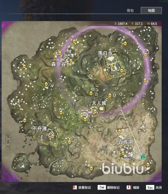 目前版本排位上分和平时匹配依然是使用聚窑洲这个场景,这张图的直径大约有两千多千米,但官方似乎没有具体数据,总体来看容纳百人是绰绰有余。打开全图可以看到几个有小黄圈边缘的区域都是高资源区,如果你上来就要一波肥的话也不要选天人城这种地方,还是百炼洞稍微靠谱一些,虽然要提前跑图但算是跳的最少的富裕点了。