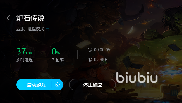 Biubiu设置的加速按钮是一键式的,小伙伴们切记玩游戏的时候要从biubiu打开炉石传说,不要直接从桌面游戏图标打开,不从加速器打开是不会有加速效果的。从下图中,玩家们也能看见加速之后,炉石传说游戏的具体情况,这一点是公开透明的,显示的网络状态是什么样就是什么样。