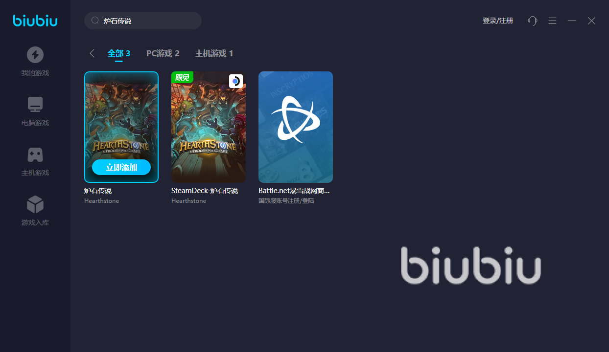 想尝试biubiu的玩家可以直接点击第一张图片下面的链接下载,小编觉得小伙伴们体验一下还是好的,反正不用花钱。下载好biubiu之后炉石传说的小伙伴们还需要在平台上输入游戏的名字选择添加,这样是为了方便后面小伙伴们玩的时候好启动。当然,先不添加也可以,玩之前添加就行了。