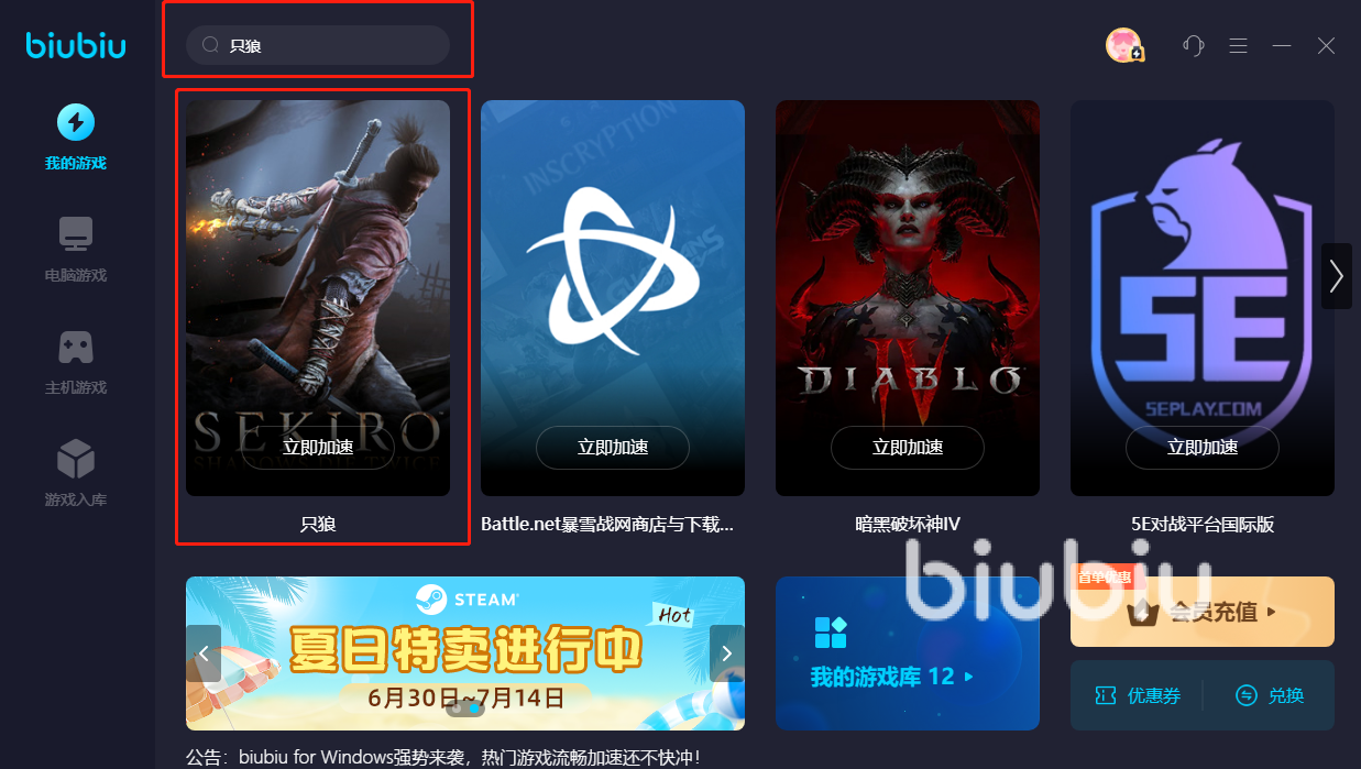 在注册成功以后,在搜索框里键入“只狼”,点击“立即添加”或者“立即加速”,就会有一个加速包被下载。在下载完成后,玩家可以自行体验,使用biubiu进行加速。在这里大家可以感受到biubiu对网络延迟的改进,使玩家可以更好的深入游戏当中。