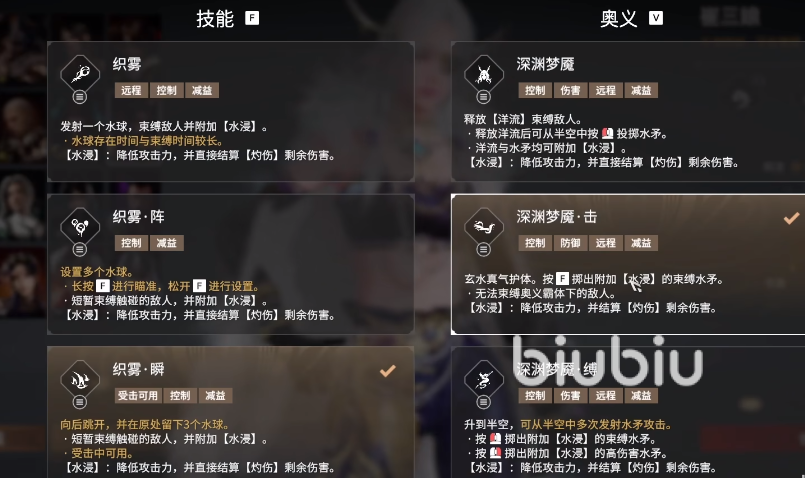 V技深渊梦魇也是有很强控制效果的,V1可以在面前扇形范围召唤洋流,所有被命中的敌人都会被水龙卷给束缚住,但是蓝霸体状态下可以躲避这种控制,在打中敌方的瞬间还可以把他们小幅度击退。要是成功束缚到敌方目标,角色本体就会跳到半空并且获得龙灵守护,且能召唤一只水矛投掷对敌人造成伤害。V2是可以提升束缚时间,但是不再召唤龙灵,而是可以自由活动。V3则是不召唤洋流,而是利用真气将自己带到半空,将敌人击退的同时有数只水矛可以攻击。