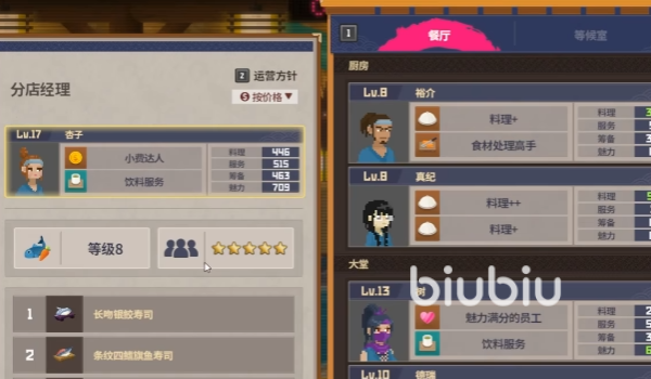 本店的前台除了一个牛战士,还可以补充一个猛禽,这样我们只需要手动磨一下芥末,就可以让猛禽一直在传菜。另外像牛战士和猛禽这种最强的人只会在高COSTA等级出现,所以线上广告招聘的时候我们一定要用400的那一档。在晚上经营饭馆的时候推荐大家使用biubiu加速器,它能让我们在畅玩游戏的同时还能避免遇到网络掉线画面卡顿等问题,新用户下载注册账号还可以免费使用会员加速3天。