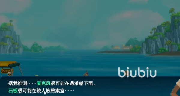接着我们原路返回浅海区,出来后向右边游。这个时候在出口处会有一条锯鲨等待着我们,这里先闪开它的第一次攻击,再用鱼叉攻击它,基本上攻击两次它就死亡了。我们再游到它身边获取材料,有几率可以获取到锯鲨肉片。获取好材料后继续向右边稍微游一会就可以看到一个泛着光的洞窟,游向那里,这个时候系统会提示我们是否前往新地区,我们选择是。等画面跳转完后界面就提示我们所在地是鲛人族档案室。