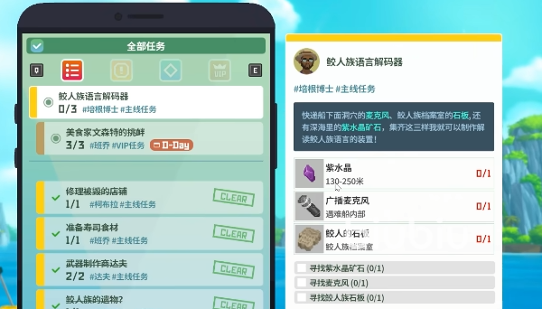 当我们将发现鲛人族的踪迹的事情告诉培根博士后,他告诉我们要制作一个能分析声波的翻译器,而这个翻译器则需要麦克风、紫水晶和鲛人族石板。我们打开计划应用可以看对应材料所在地点,其中石板的所在地就在档案室。因为档案室可能在很深的地方,所以最好是装备极限深度350米的潜水服,鱼枪的伤害更改为气泵鱼叉,调整好装备以后就可以按空格键下水了。