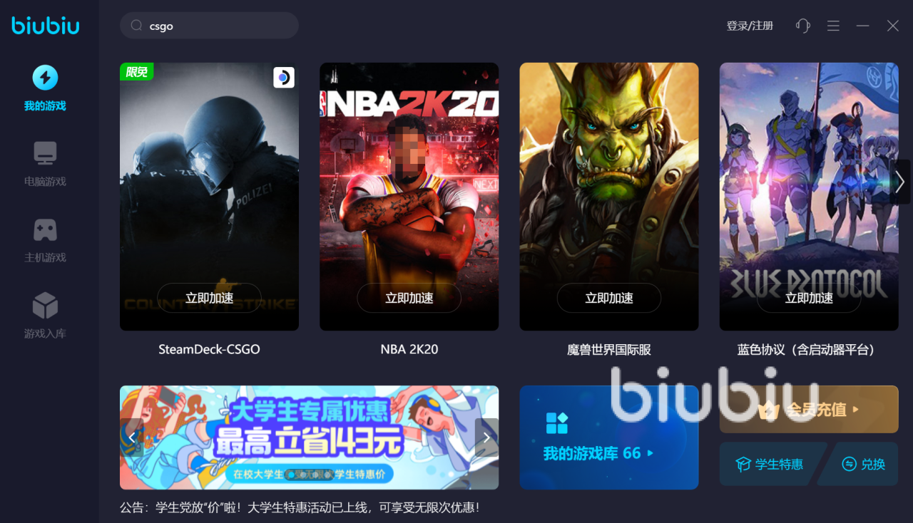 提到biubiu加速器应该有很多的玩家都对它不陌生吧,它加速效果非常的明显,可以帮助大家很好的解决延迟的问题和掉线等问题,操作方式也非常的简单,直接点击上边为大家准备的链接就可以快速的下载拥有,第一次登录的用户,直接就是会员身份,这个特殊福利你可以享受三天的时长,在主页直接编辑反恐精英就可以搜索出来该游戏了,在游戏的下方点击加速就可以了。
