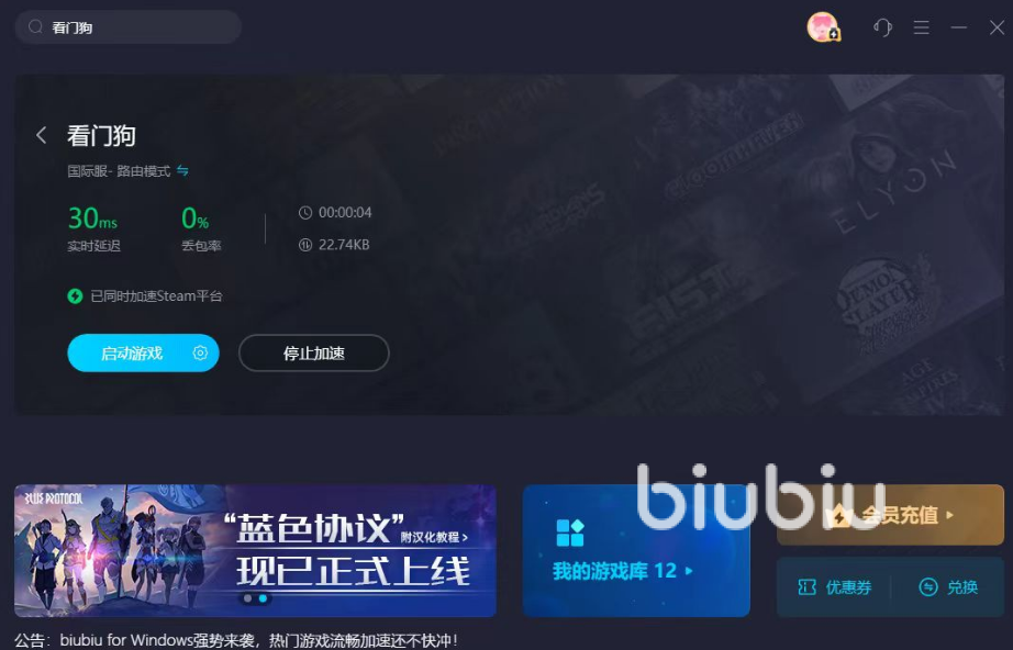 我们在biubiu软件中左侧的游戏分区中可以检索目前支持的游戏作品,当然直接搜索的话速度会更快。如果大家搜索看门狗,会发现除了一代作品之外,还能够给看门狗2以及军团这两部后续的作品进行加速。不仅如此,除了PC版本,biubiu还提供了蓝绿双主机版本的支持,这两个主机版本不花钱就可以直接使用加速啦!PC玩家也不要泄气,新用户点击上方按钮下载加速器应该是可以领取到免费三天的会员,在到期后也可以参加首充优惠的活动,用比较低的价格去开通会员,也是相当划算的,众多的作品供你任意提速!