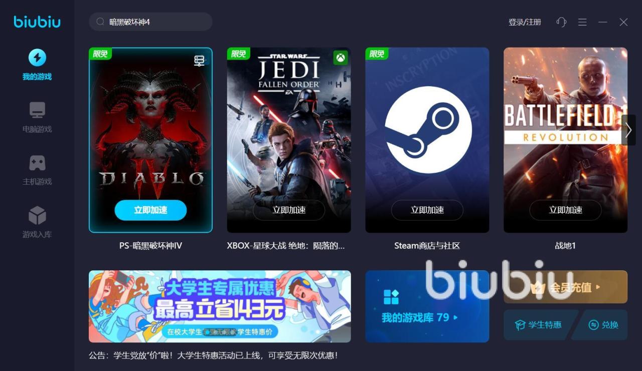 暗黑4中,用户可探索的地方增多,但与之而来的问题,就是在切换地图时,画面会发现卡顿,导致游戏过程不太顺畅,造成这种状况的原因,很大可能就是网络不稳,想要解决,可以去试试biubiu加速器。其中的网络优化服务,可以降低延迟,减少卡顿出现的概率。想要启动这个功能,只需在软件内,搜索到暗黑4专属的加速入口,接着点击立即加速即可。如果你是第一次用这个应用,那么还会享受新用户注册免费使用加速3天的福利。