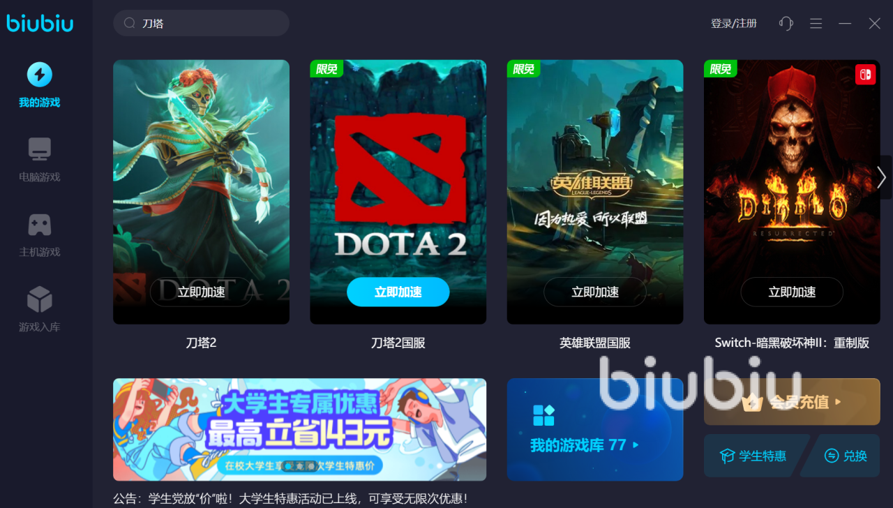 有需要的伙伴你可以直接登录biubiu官网去下载,或者点击小编上边给到的链接,快速注册就可以登录,只要你是首次用这个加速器,登录就享有72小时的免费试用期,直接搜索刀塔2,并启动加速就完成了。除此之啊,平台还为大家推出了很多的免费国服游戏加速的活动,这款游戏也包含在内,所以前期大家不必担心费用的问题。
