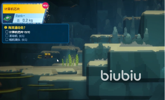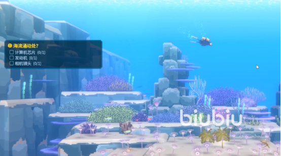 等到白天,我们下海要去找一些道具,可以在左侧看到道具名称,分别是计算机芯片、发动机和相机镜头。我们一直往下游,当到达钟乳窟之后,找到海底喷出气体的地方,就会找到这些材料了。