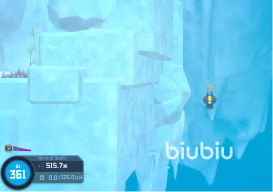 之后,一直往下游,在下潜的路上,我们也可以隐约看到左侧的白鲸。绕过这个巨大大冰层往左游,路上会有各种各样的食材,记得击杀带走。然后往上游,这里就会来到冰川洞窟左下角的入口。