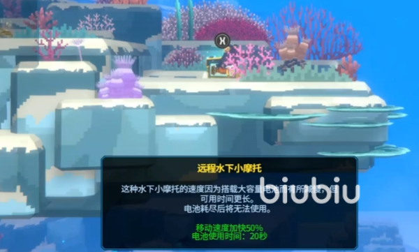 下海之后我们往下方游走,看到黄色的箱子可以去开一下,有几率开出远程水下小摩托。这个道具可以让我们在水下待的时间更长,但缺点就是速度会有点慢。接着继续靠右边往下游,期间如果遇到有红色标志的鱼类一定要小心,这种鱼类会主动攻击我们。遇到它们我们有两种处理方法,第一种是快速换方向游走远离它,第二种就是提前主动攻击将它们杀死。第一种方法可以省点武器的消耗度,而第二种则可能获取更多的食材。