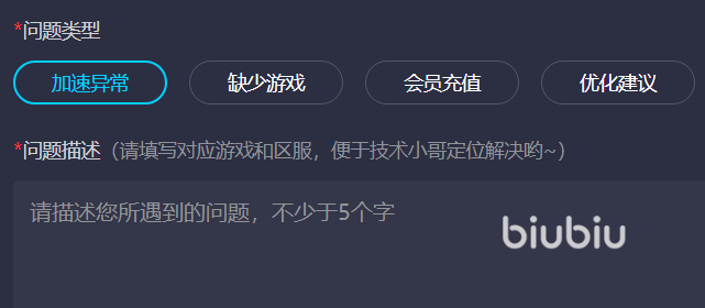 平台上那么多游戏不信大家不够用的,国内外的游戏都有,可以说百分之八九十的游戏都可以通过搜索加速。大家过在使用过程中发生问题的,比如充值问题、加速异常或者建议都可以找到右上角进行反馈的,这一点还是很不错的,只有听取了用户的意见才可以发展地更好。现在新用户注册免费使用加速3天,大家都可以去试试的,所以能够体验的确实够给力了。大家如果用过了其他加速器,到头来还是觉得biubiu加速器好,综合考虑的话,值得推荐。