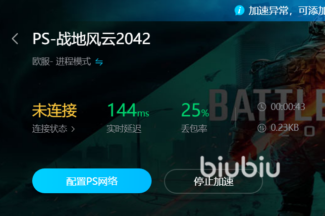 大家接触过得枪战游戏肯能也不少了,就拿最火的绝地求生来说吧,这款游戏如果没有加速器辅助的话,在开局跳伞之后,你的游戏角色的动作会看起来特别的卡顿,人已经落地了但是周围的建筑都还没有刷新出来,这就导致别人都捡到枪了,你还卡的找不到枪,而战地风云2042这款游戏的规模只比绝地求生大不会小,大家可以运行biubiu加速器来缓解游戏卡顿,游戏开始前,运行biubiu加速器,如果没有用他加速过,直接搜游戏名,直接对游戏加速后打开游戏。玩起来就会舒服多了。