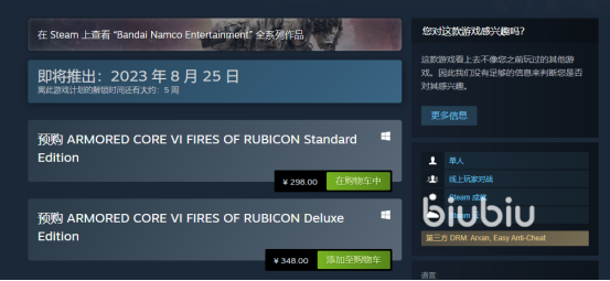 并且,预购还可以确保玩家们在游戏发售,能第一时间开始游戏,快人一步的同时,也能避免错过任何精彩内容。此外,万代的口碑也是家喻户晓,他们历时多年打造的装甲核心系列还是很值得期待的。