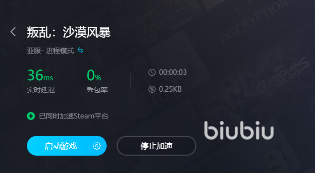 游戏的加速效果也是全程公开透明的,玩家可以在biubiu平台上看到沙漠风暴游戏的加速情况,实时监控。不过要记住的是,在结束游戏之后要回到biubiu关掉加速按钮,减少电脑运行出现的内存空间。