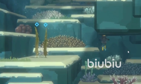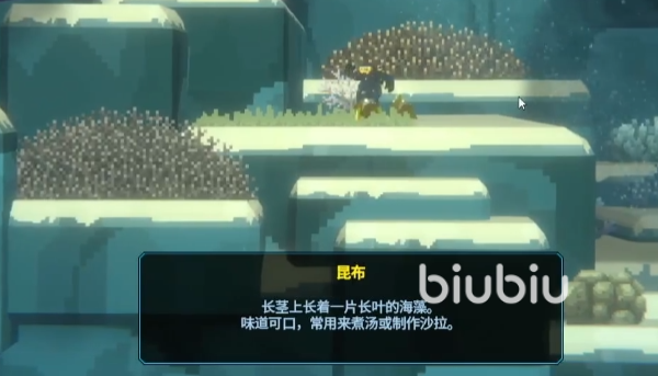 这类植物的颜色是橄榄褐色,我们看到像长条海带一样的两根竖着的海洋植物就是了。游到附近时需要按下鼠标左键先进行切割,之后会在地上掉落两块物品。这个时候再按键盘上的空格键进行采集,系统便会提示我们采集到昆布了。