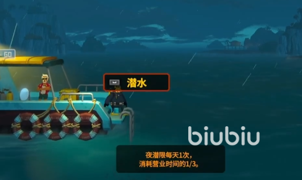 当出现按钮提示的时候,我们会发现潜水的标志变成了红框黑底,并且在屏幕下方会有个提示。我们从提示里面可以在夜晚进行潜水只有一次行动机会,这就意味着如果当天晚上没有找到需要的鱼类,那么就得等到第二天白天两个时间断过去后才能更次入水捕获了。在玩游戏时推荐大家可以同步使用biubiu加速器,它能让游戏保持低延迟的网络速度,并且还支持STEAM商店平台免费加速,现在新用户下载并注册账号可以免费体验三天的会员加速通道哦。