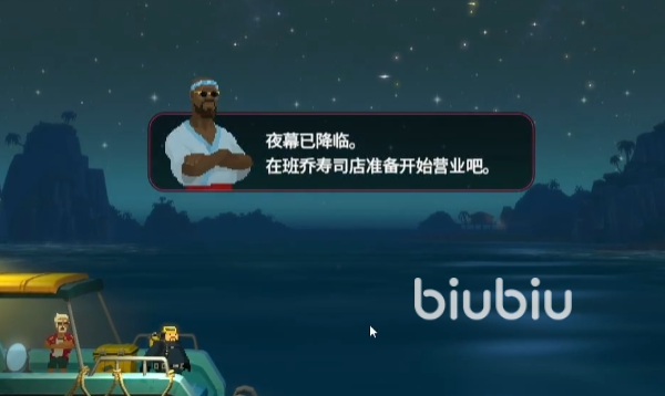 一般情况下系统到了晚上会提示我们夜幕已降临,要去班乔寿司店准备营业了。这个时候我们可以选择不去管这个提示,等它消失后继续向右走向潜艇的边缘。