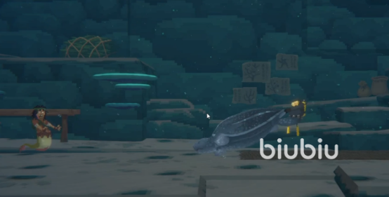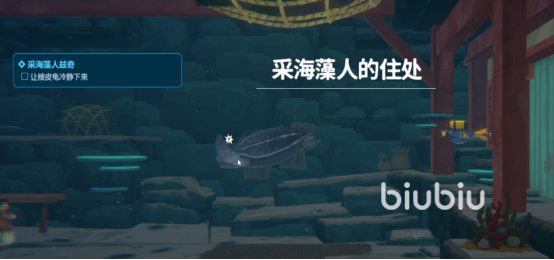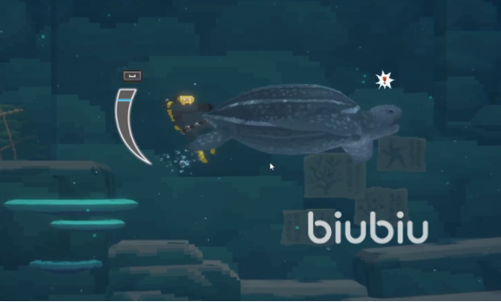 当我们往它的位置游动时,它会立刻游开,不让我们靠近,但是我们需要接近它,然后拽住它的龟壳,疯狂按空格键,让它冷静下来。所以需要玩家们智取,我们可以先在上方,等乌龟游到了两边,掉头时,我们从中间下来,或者如果氧气充足,可以加速追上多纳。