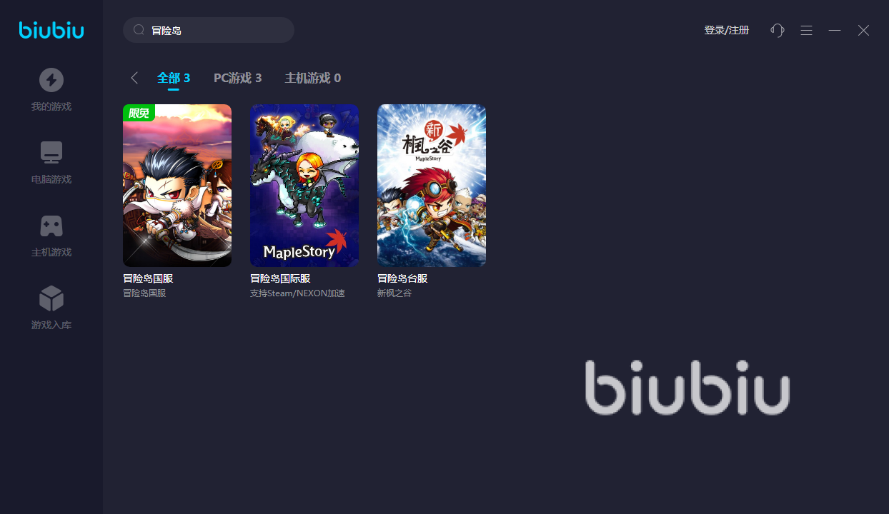 下载注册好biubiu之后,点开平台的页面找到最上方的搜索框,点击搜索冒险岛美服版本,就可以直接添加冒险岛游戏了。后面玩家想玩的时候,直接从这点开启动游戏就行。除了冒险岛以外,其他很多的游戏都有,而且不仅有端游版本的biubiu加速器手游版本的加速器也有。所以无论喜欢玩端游还是所谓手游的玩家都可以选择,十分专业。