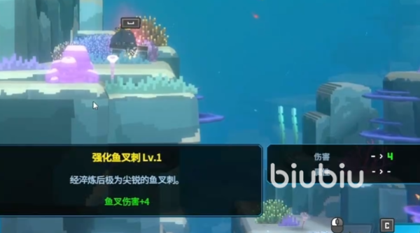 我们可以按雷达的的方向去游,途中如果遇到紫色的武器箱可以开下,有几率可以开到其他武器或者鱼叉的相关强化,例如强化鱼叉刺可以增加伤害,而毒鱼叉则可以让在用鱼叉攻击时让鱼类中毒。在寻找目的的过程中会遇到一些主动攻击的鱼怪和鲨鱼,这里很多小伙伴都躲不过鲨鱼的攻击。