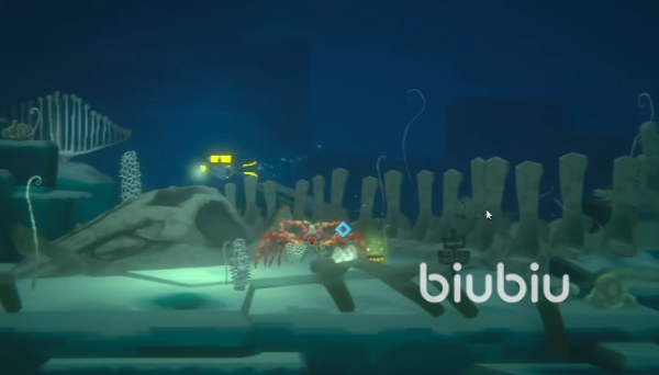 我们接取完任务后直接向左走,出了鲛人村到达深海区域,之后继续往左前进。当看到一块大型的骨头区域时,就可以发现代表着任务物品的蓝色菱形标志。但这个时候在物品周围有一个红色的螃蟹生物在守护着,当我们游到珊瑚附近时,它会主动过来攻击我们,而这个螃蟹我们用枪或者鱼叉是攻击不了的。