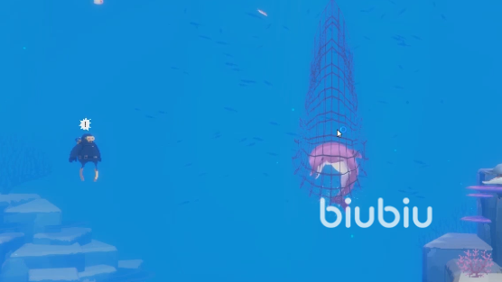 经过多次攻击,终于成功的解救出它,两只小可爱也依偎在一起,相互环绕着游动,然后一起靠近主角表达了感谢,并且赠与了礼物,一个超级大的金块。这个完成之后,玩家就可以开始正常的捕捞作业了,赶紧抓食材啦。