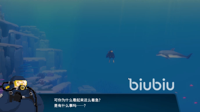 正常的一天清晨,艾莉会告诉玩家生态监察员这些事,看完之后的对话,主角就可以自由活动了。当然每一天他都是有重担在身的,不去捕捞足够的鱼类,根本没有办法维持店铺的经营。在刷完手机里面的提示内容之后,一下海就会看到一只蓝色海豚停留在角色面前,仿佛在请求什么。