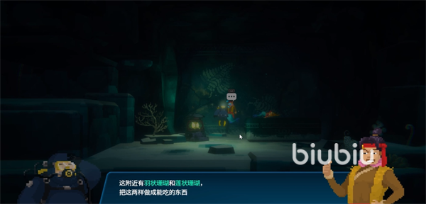通过对话我们可以得知想要拯救公主,需要找到羽状珊瑚和莲状珊瑚,然后将珊瑚制作成食物进行喂食才可以。对话完成后先原路返回通过触手区,然后在向左通过另外一个触手区。之后下潜即可找到羽状珊瑚。