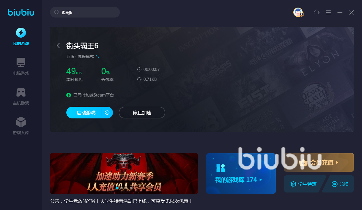 既然是格斗游戏,自然对网络有着更高要求,为了能够尽快做出反应,先发制人,很多玩家都会使用加速器来对自己网络进行再次优化,获得较低延迟。而biubiu加速器就是使用最多的一款软件,这款辅助工具通过自身核心功能真正做到了充分利用起网络资源,在不更换硬件和网络情况下,能够让数据交换更加流畅。即使是在开启高特效情况下,也不用担心出现卡顿、掉帧等问题,单人模式能够更加流畅,多人竞技自然就能占据网速上优势,在开局就能利用这一点占据优势。