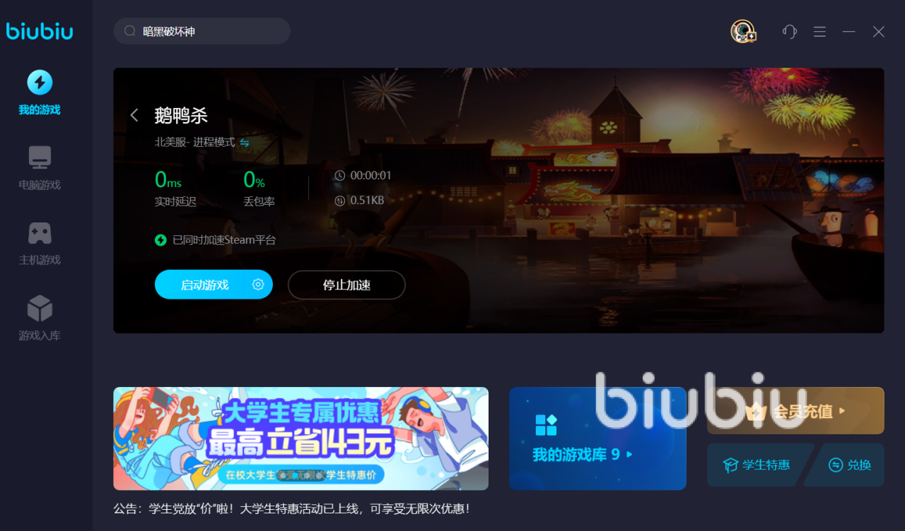 以上就是鹅鸭杀加速器选择哪个好的所有相关内容,每次Steam喜加一需要入库游戏的时候都进不去大厅界面都可以用该加速器来快速的解锁,喜欢玩PC端游的玩家可千万不要错过biubiu加速器为大家准备的免费试用和新人折扣活动,赶快点击上方链接下载试试吧。