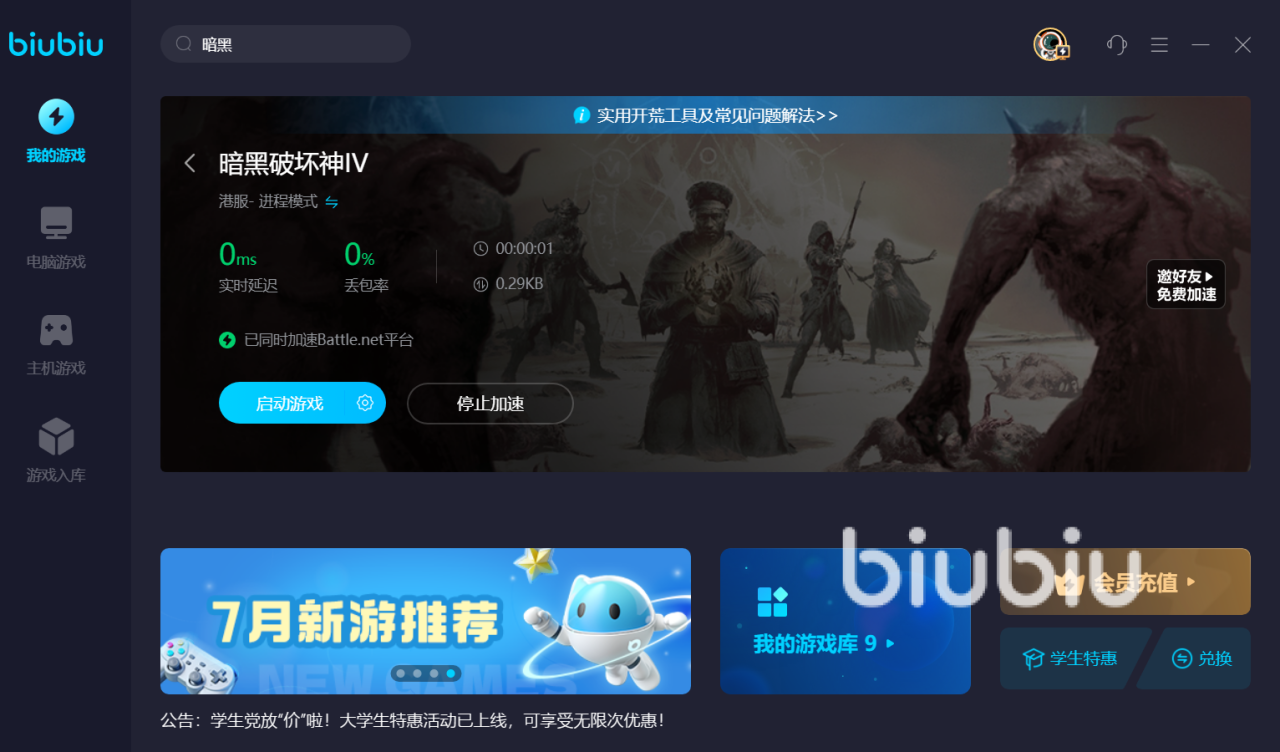 暗黑4游戏显然并不是很吃电脑的配置,游戏的服务器直接架设在韩国,而且在和队友交流的时候游戏是默认使用一部分网速去进行翻译的,如果这时候还会有新的游戏内容非常影响玩家们使用野蛮人、猎魔人等等在刷怪的时候做出一系列连招,尤其是在组队的时候,很可能导致整个队伍的努力白费,使用biubiu就可以很好的解决这种卡顿问题,而且该加速器支持steam商店平台和暴雪商店平台免费加速的。