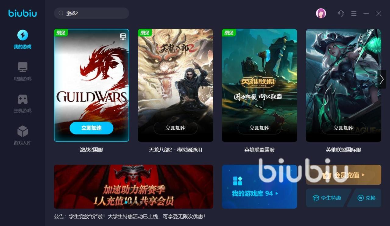 以上就是激战2掉帧怎么办,如今新上线的游戏,对设备性能,以及接入网络的要求越来越高,玩家们在体验的时候,经常会碰上掉帧、黑屏、卡顿等现象,如果不是硬件的毛病,那么可以试试biubiu加速器。