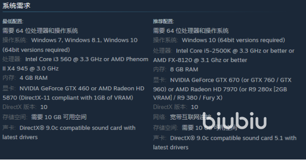 在详细的最下面也说明了游戏配置需要64位的处理器,操作系统最低需要是WIN7的。DX版本最少需要达到10,并且内存最少要保留4GB,同时硬盘上要预留10GB的存储可用空间。而推荐配置里面的内存也只需要8GB,可以说要求不是很高了。