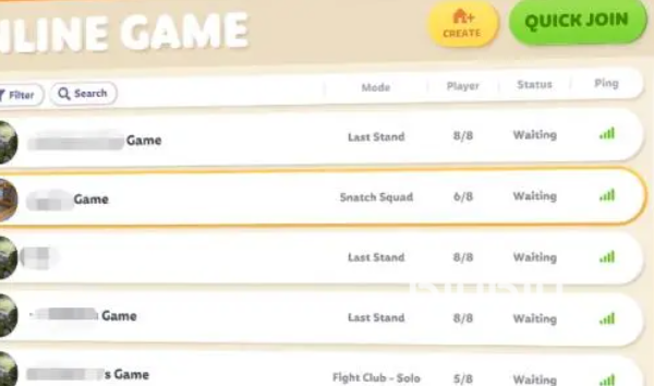 在左边选项的第一个便是在线模式,我们点击进去后会出现一个界面,在这个界面上可以看到一些在线玩家建立的房间以及目前房间的人数,我们可以在这个列表搜索好友的房间号进入。如果有小伙伴只是想要随机加入的话,可以点击右上角的快速加入按钮。当然如果想要自己当房主的话,可以点击右上角的黄色房子按钮,进行创建房间的设置。