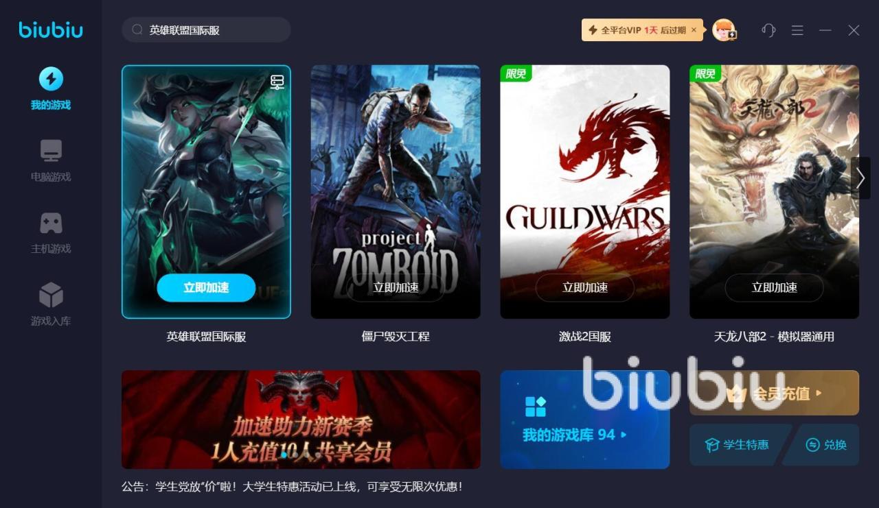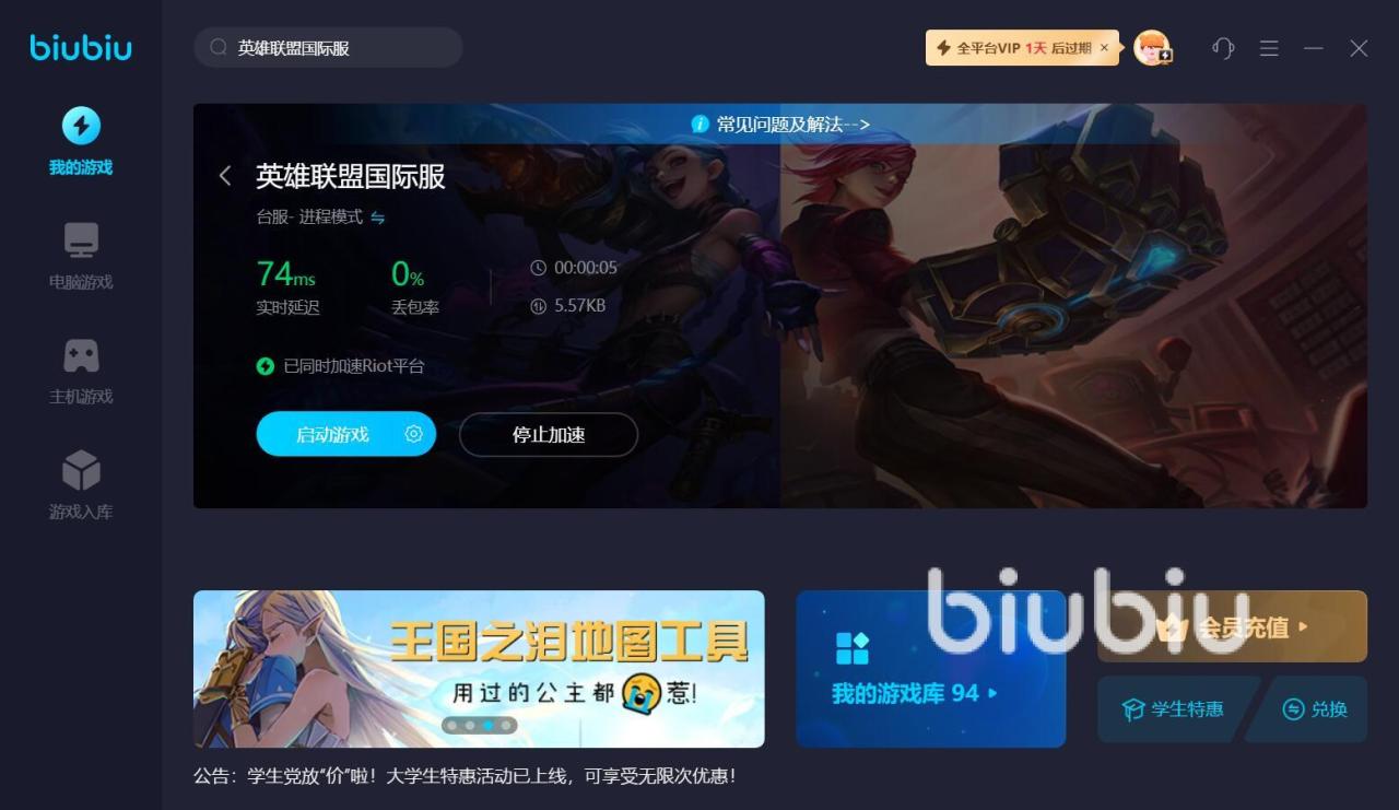 除了大家常玩的国服外,在世界各地都有lol的服务器,与国内重竞技,内卷严重的游戏氛围不同,在海外的一些区服内,玩家的水平差别不大,并且心态都很好,不会太计较胜负,要是你想感受一下海外的游戏环境,那么可以使用biubiu加速器,找到英雄联盟国际服的加速入口,然后点一下立即加速就行了。现在注册登录,还能享受到新用户注册免费使用加速3天的福利。