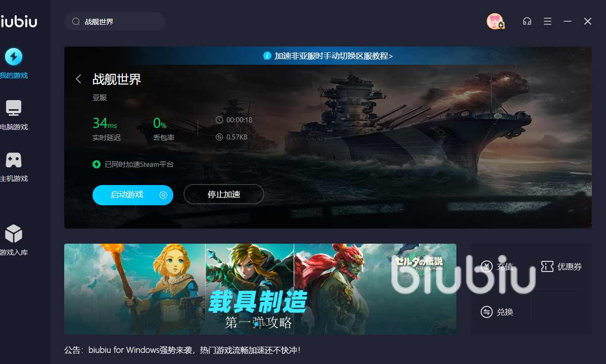 后台可以清晰的查看丢包率,延迟率和加速时间,让进清楚的了解每秒钟的各种数据情况。强大的兼容性不仅能够给你手机和电脑游戏提升速度,就连主机的游戏也是通过它来加速的。丰富的游戏库中你可以看到很多的游戏,近来平台还推出了限免的国服游戏,这就给未使用过的用户一次特别好的机会,通过简单的尝试,慢慢的熟悉并了解biubiu,然后再做选择特别的人性化。