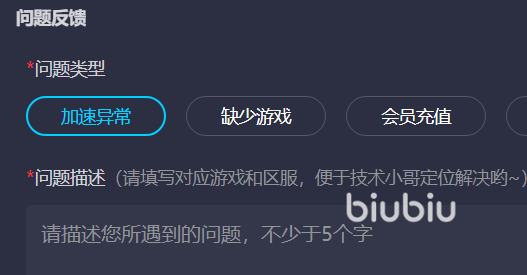 如今biubiu加速器已经跟着时代的发展慢慢做出了改变,一些实用的功能也是应运而生。一般小伙伴们都会诉苦没有地方进行问题反馈,现在的话就可以找到平台的右上角了,里面的窗口供大家提出自己详细的需求或是问题,非常人性化。而且对于游戏板块的内容,大家找biu仔应该速度会更快一些。对于大家想要了解的新用户注册免费使用加速3天的活动,一直都在进行,快叫上小伙伴一起来玩吧。
