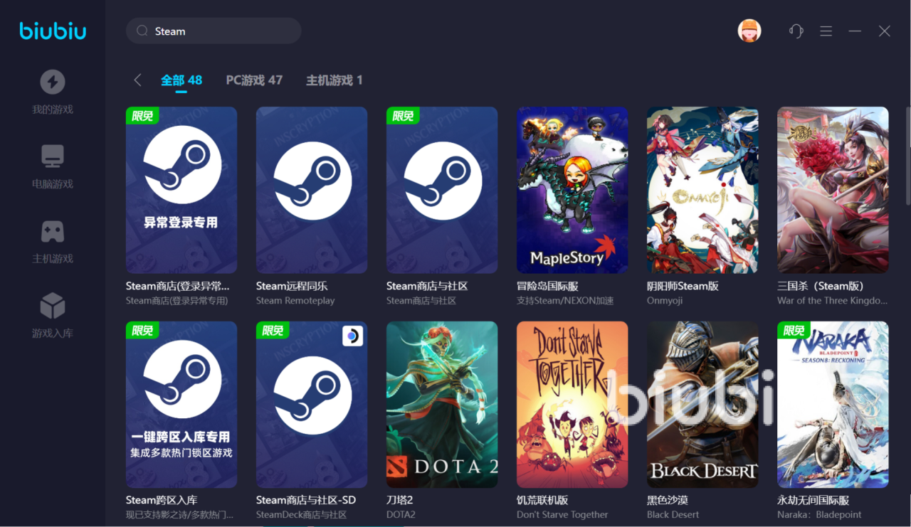 现在好多加速器都喜欢用一些通用的模式来去加速,就是说你想加速Steam平台的游戏的话,就直接去对Steam全平台游戏进行加速,采取这种方式的理由也很简单,那就是维护成本低而且效果没有任何的保障,基本只要是开了会员就没有售后的一说,要是担心这种鸡肋问题出现的话,就干脆到能为用户负责到底的biubiu加速器去进行,它加速游戏都是根据用户的搜索来进行,就像你要加速pubg就不会影响到其他的游戏。