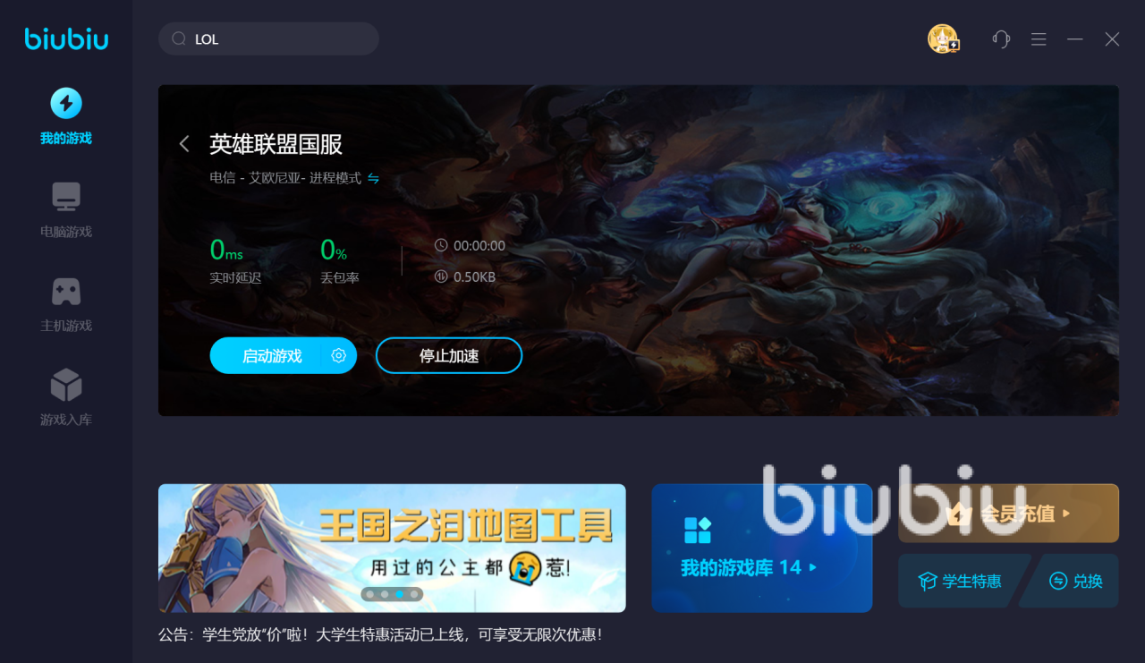 2023年07月25日 14:38 来源:玄冥正卡比兽lol这款多人在线团战竞技游戏对于玩家们之间的技能平a乃至走位的配合要求都是相当严格的,一波的掉帧或者是网络卡顿导致的结果可能是一波团灭,有很多玩家想知道配置足够但玩lol掉帧怎么办,其实这也是小编在之前电脑设备不好的时候非常困扰的问题,想要畅玩lol其实并不难,小伙伴们可以跟着小编一起来看看biubiu加速器。