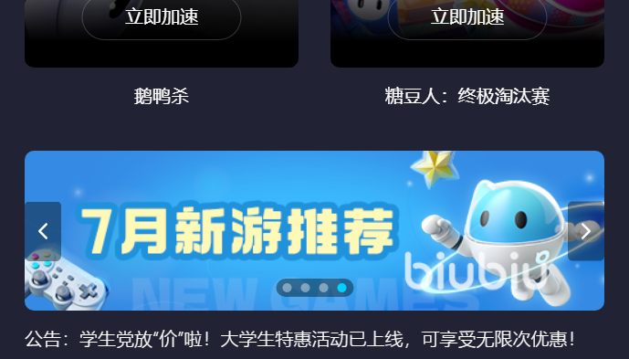 像很多小伙伴都是想在第一时间玩上像鹅鸭杀一类的热门游戏,因为大家的一致选择肯定是不会错的。所以在biubiu加速器的平台上有着专门的热门游戏专区,里面的游戏都是当下小伙伴玩的较多的,另外游戏的第一手讯息也都是在主页上可以查看的,这一点不知道小伙伴们有没有注意到,就在下面的活动栏内,平时本就关注游戏的小伙伴也多了认识游戏内容的一个窗口。现在还推出新用户注册免费使用加速3天的福利,首次下载玩家真是幸运了。