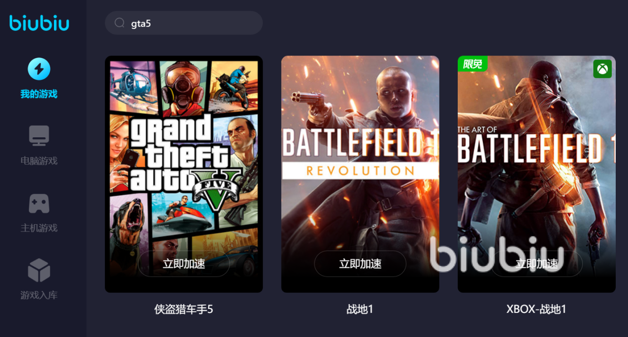 随着各大游戏对网络的要求越来越高,也就出现了各种各样的加速器,小编只所以强烈的推荐这款加速器,是因为此款加速器可以对gat5进行加速,也可对其他的大型游戏进行加速,biubiu加速器里面的游戏数量非常多,现在非常火爆的各大游戏,在这里都可以找到并进行加速,无论是加速还是停止游戏加速,随时都能切换。